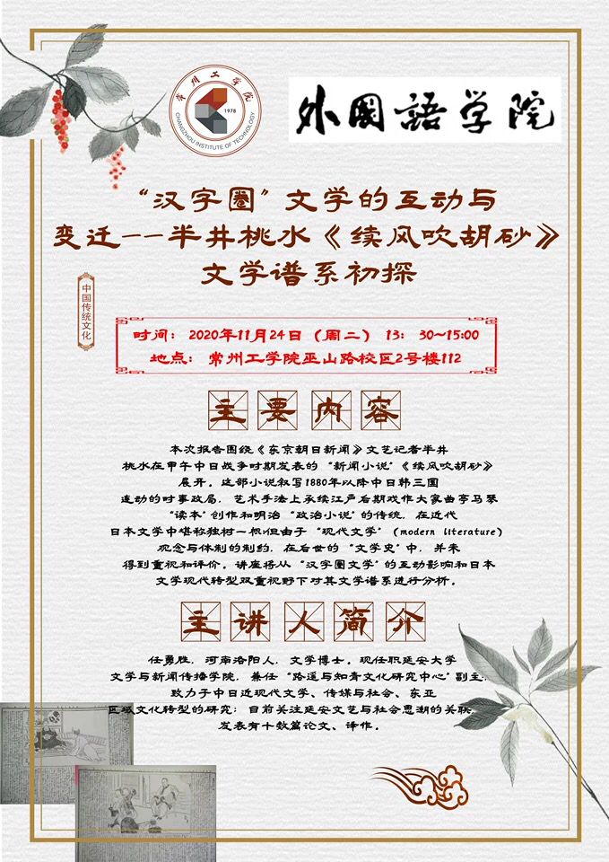 11月24日 | 学术讲座:“汉字圈”文学的互动与变迁——半井桃水《续风吹胡砂》文学谱系初探