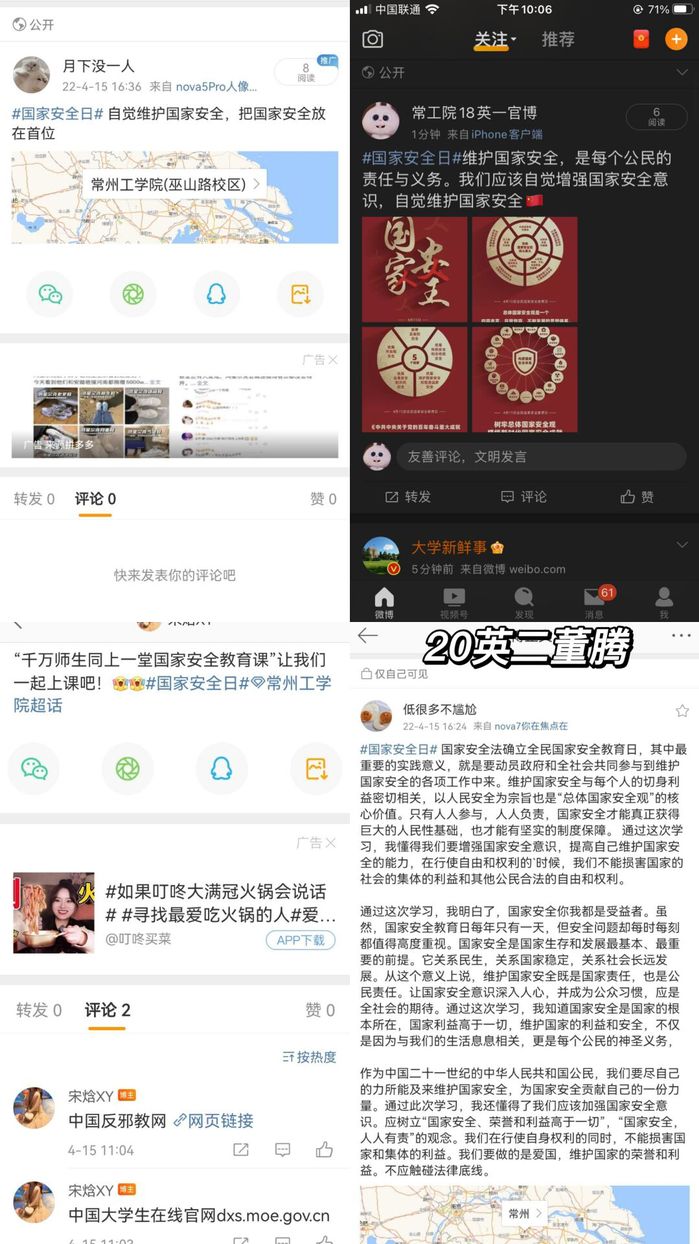 外国语学生会牵头带领各班级开展全民国家安全日系列宣传活动,18商英二王丽莉积极主动指导各班级通过关注中国大学生在线视频号、微博等直播平台及中国大学生官网,错峰观看“千万师生同上一堂国家安全教育课”主题公开课。20英二班董腾在微博发布个人感言,鼓励和带动大家在微博上以“国家安全日”为话题参与互动,发表观看视频的感想,让更多的人了解国家安全日,切实增强全民国家安全意识和法治意识,同时呼吁大家在中国大学生在线平台观看反邪教警示教育宣传片,让学生了解国家安全教育日设立的目的和意义,学习国家安全的相关法律知识,明白国家安全的重要性及有关学生的自身安全。