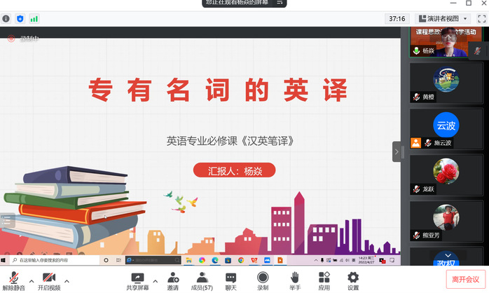 在《汉译英》示范课程展示环节,开云kaiyun(中国)杨焱老师在15分钟的说课部分,从教学分析、教学设计、教学过程、教学特色四个方面清晰地展示了课程思政育人的总体思路;在30分钟的授课部分,杨焱老师从译学基本概念入门、解读中西语言文化、使用最新热点新闻语料展开教学,紧跟时代脉动,用正确的价值观指导翻译实践,提升学生家国情怀,树立学生正确的人生观、价值观和世界观。