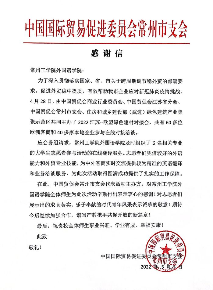 活动中,大学生志愿者们凭借较好的外语能力和外贸专业技能,通过Zoom平台为中外客商实时交流提供了较为精准的英语翻译和业务洽谈服务,为活动圆满举行提供了扎实的工作保障,中国贸促会常州市支会特发来感谢信感谢学院青年学子的辛勤付出。