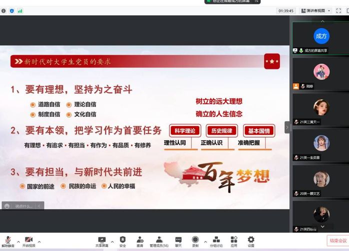 刘一鸣以《中国共产党百年奋进新征程》为主题,详细介绍中国共产党百年奋斗历程各个时期的历史任务,阐述党史教育的重要意义。希望学员认真学习习近平总书记在庆祝建团100周年大会上的讲话,新时代树立新目标,积极向党组织靠拢,努力成为新时代的接班人。成方围绕党的性质和宗旨,通过党对自身性质和宗旨的认识历程阐述,引导广大积极分子进一步加深党的知识、坚定理想信念。陆婷讲解了党员的权利、义务以及入党步骤,让同学们更清晰了解了入党的程序,进一步端正入党动机。