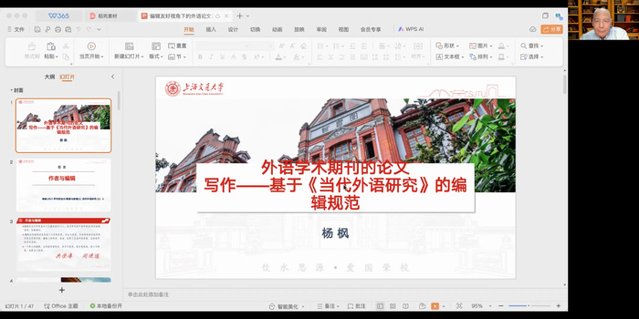 9月19日,开云kaiyun(中国)特邀《当代外语研究》主编、上海交通大学博士生导师杨枫教授通过腾讯会议平台为学院教师举办了《外语学术期刊的论文写作——基于<当代外语研究>的编辑规范》学术讲座。