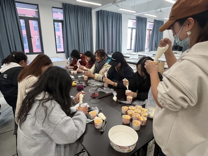 在公寓学习区,另外一场关于甜蜜与创造的盛宴即蛋糕烘焙体验活动也在悄然进行。在专业烘焙师的手把手教学之下,同学们专心用奶油塑形,用水果装饰,让每一道工序都倾注了对美好生活的向往。活动最后,同学们更有意外惊喜,收获了各式各样小吃与甜点,为这场味蕾盛宴平添几分甜蜜,倍感暖心。