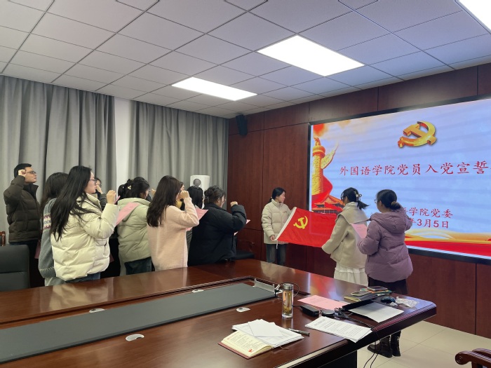 党支部书记朱映然带领新党员面向党旗庄严宣誓,表达对党的忠诚和为共产主义事业奋斗的决心。党委副书记俞贤辉讲话中向新党员表示祝贺并提出殷切期望。他希望全体党员要坚定理想信念,强化理论武装,牢记初心使命;要立足本职岗位,践行党员标准,发挥先锋作用;要提升专业能力,拓展国际视野,讲好中国故事;要严明纪律要求,恪守入党誓词,加强自我锤炼。他明确提出新党员要以宣誓为新起点,用行动践行誓言,在学院的各项工作中发挥好作用。