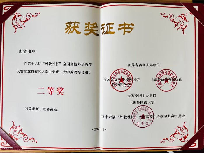 经过激烈角逐,张清老师参加大学英语综合组传播中国主题比赛,凭借出色的教学设计、流畅的课堂展示和深厚的专业素养,最终荣获决赛二等奖的优异成绩。充分展示了我院教师在外语教学方面的专业水平。