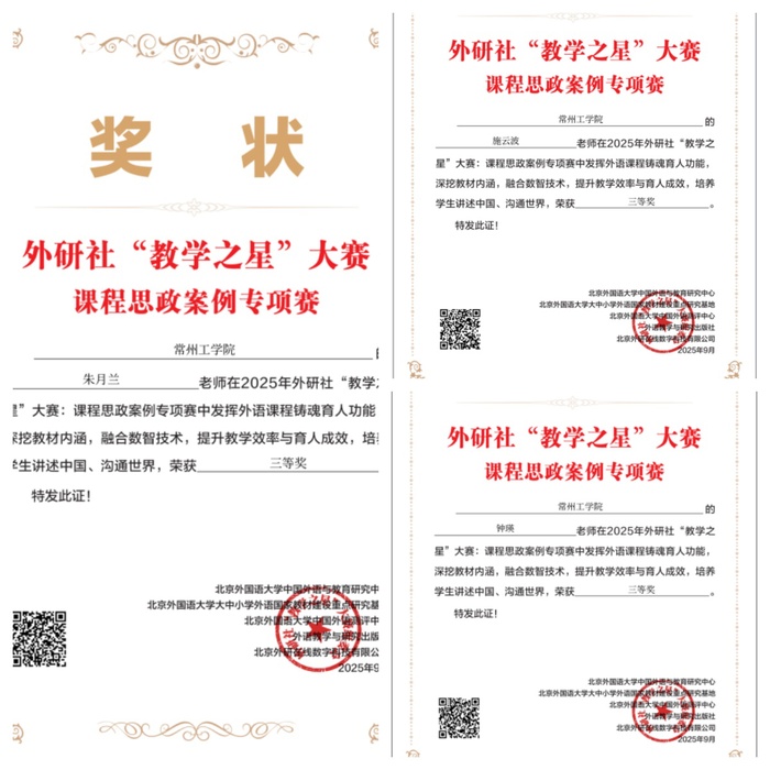 近日,2025年外研社“教学之星”大赛课程思政案例专项赛评选结果正式公布。开云kaiyun(中国)朱月兰、钟瑛、施云波三位教师凭借其精心设计与实施的课程思政案例,在全国众多参赛作品中脱颖而出,荣获全国三等奖。