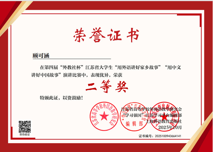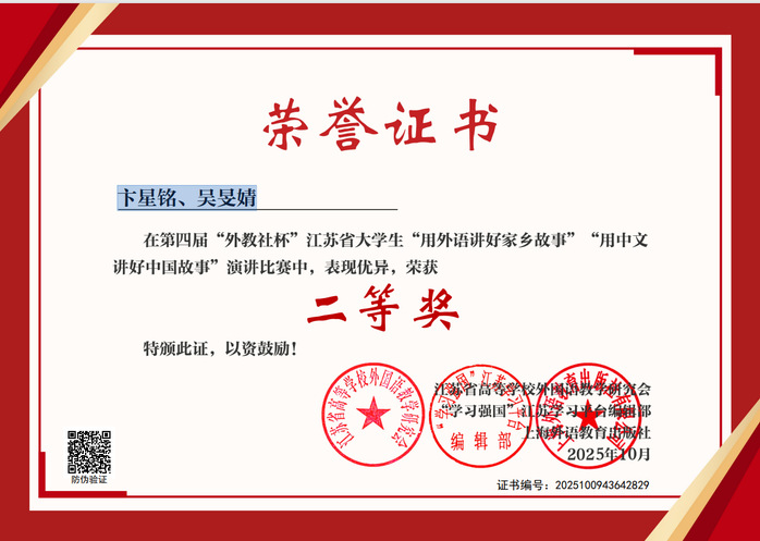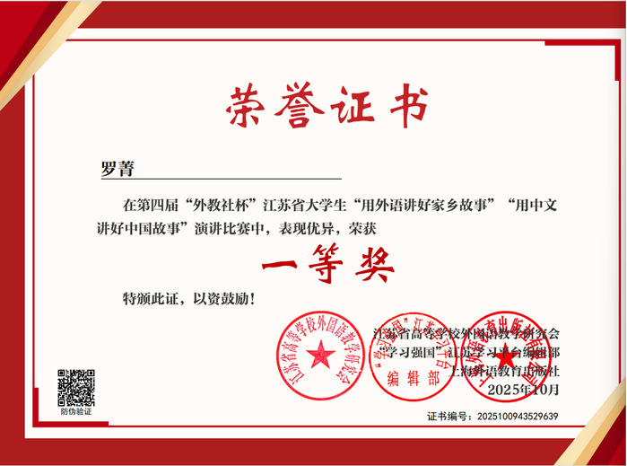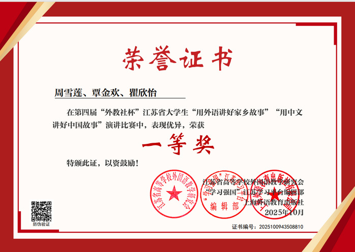 本届赛事由江苏省高等教育学会指导,江苏省高等学校外国语教学研究会、“学习强国”江苏学习平台、上海外语教育出版社主办,被江苏省高等教育学会认定为 2025年全省普通高校本专科生学科竞赛省级赛事(苏高教会〔2025〕26号),旨在响应“讲好中国故事,传播好中国声音”的重要精神,为中外学子搭建一个高水平的文化交流与展示平台。决赛中,来自全省各高校的选手们用语言为桥,以故事为媒,呈现了一场精彩纷呈的跨文化交流。此项赛事不仅是我校学生语言能力与个人才华的展示舞台,更是他们对中国文化深刻理解与认同的集体表达,让家乡故事在新时代焕发出新的生机与活力!